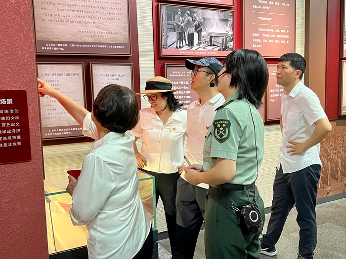 百色起義紀念館以鄧小平同志的革命歷程和紅七軍戰斗史為主線,通過六大主題展廳、千余件珍貴文物及歷史影像,全景式展現了中國共產黨領導右江革命根據地軍民浴血奮戰的壯麗篇章。黨員們在講解員的帶領下,依次參觀《起義烽火》《蘇區建設》《永放光芒》《浩氣長存》《璀璨群星》《偉人足跡》展廳,駐足于斑駁的土槍土炮、泛黃的《土地革命綱領》手稿、鄧小平同志使用過的馬鞭等文物前,聆聽紅七軍“千里遠征”、韋拔群“毀家紓難”等感人事跡。通過場景復原、全息影像等技術,生動再現了鄧小平、張云逸、韋拔群等革命先驅領導百色起義、創建右江革命根據地的崢嶸歲月。