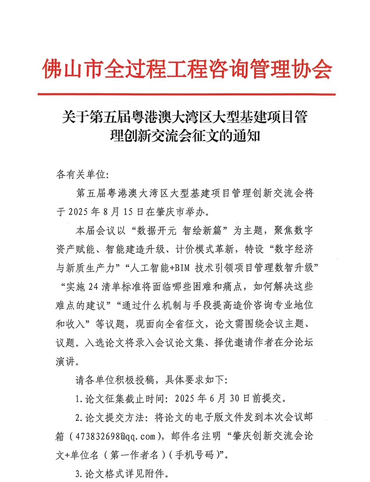 關(guān)于第五屆粵港澳大灣區(qū)大型基建項(xiàng)目管理創(chuàng)新交流會(huì)征文的通知