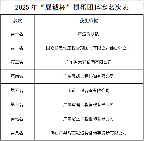 2025年“展誠杯”摜蛋團體賽圓滿落幕!在此,特別鳴謝副會長單位廣東展誠工程咨詢有限公司的鼎力支持,為賽事的順利開展提供了堅實保障;同時,衷心感謝所有參賽選手的全力以赴與工作人員的辛勤付出,是大家的共同努力鑄就了本次精彩的賽事。讓我們共同期待下一次的相聚,持續(xù)深化行業(yè)交流協(xié)作,共譜發(fā)展新篇!