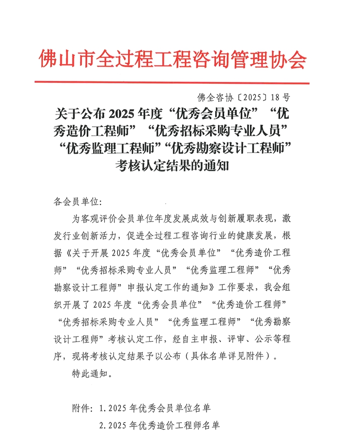 關(guān)于公布2025年度“優(yōu)秀會員單位”“優(yōu)秀造價工程師”“優(yōu)秀招標采購專業(yè)人員”“優(yōu)秀監(jiān)理工程師”“優(yōu)秀勘察設(shè)計工程師”考核認定結(jié)果的通知