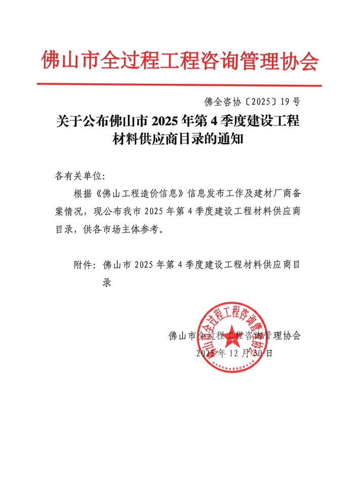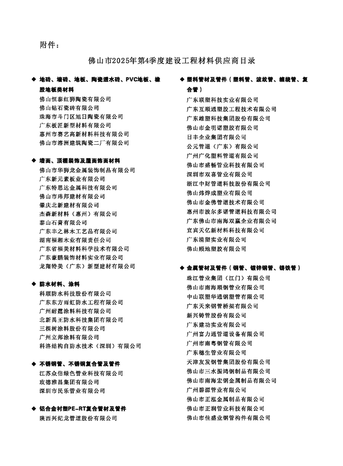 關于公布佛山市2025年第4季度建設工程材料供應商目錄的通知