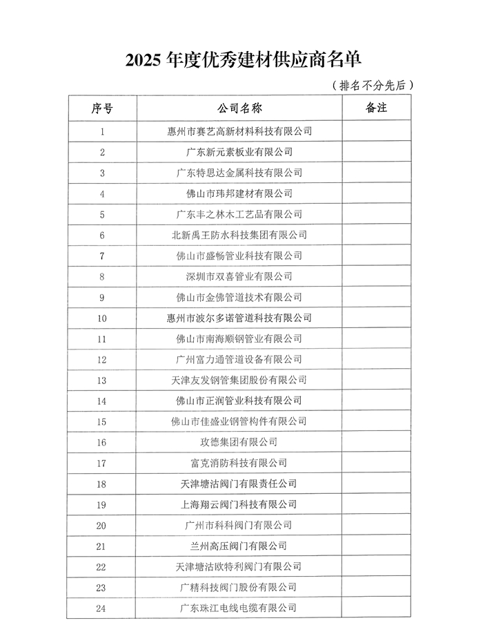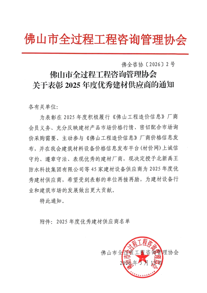 佛山市全過程工程咨詢管理協會關于表彰2025年度優秀建材供應商的通知
