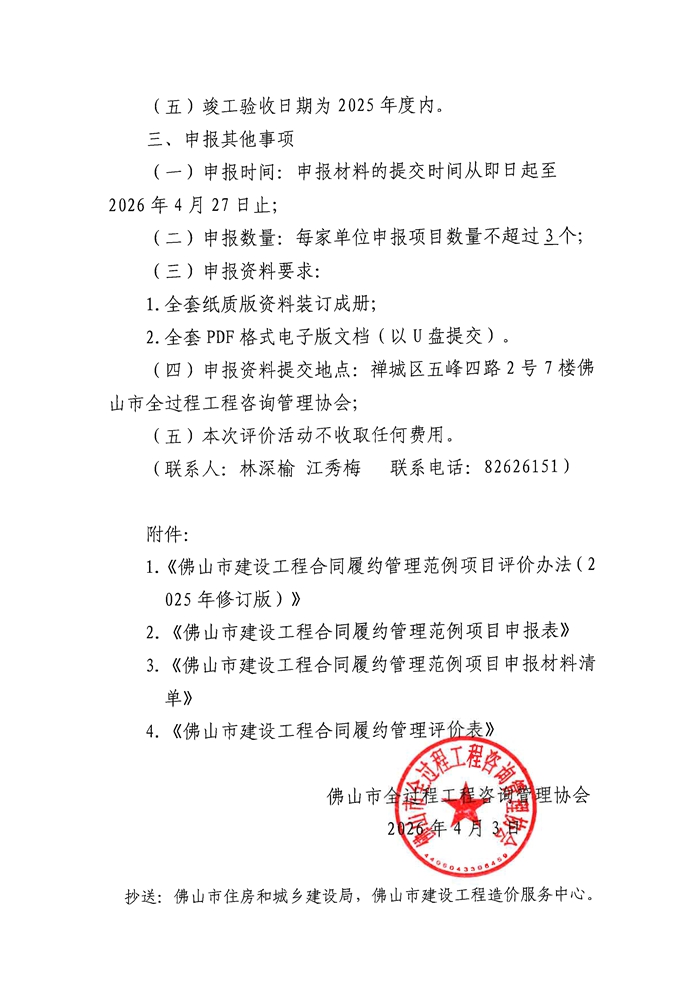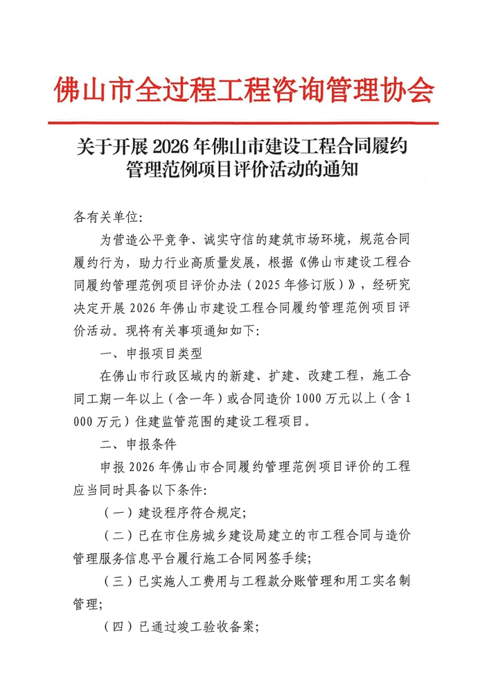 關(guān)于開(kāi)展2026年佛山市建設(shè)工程合同履約管理范例項(xiàng)目評(píng)價(jià)活動(dòng)的通知