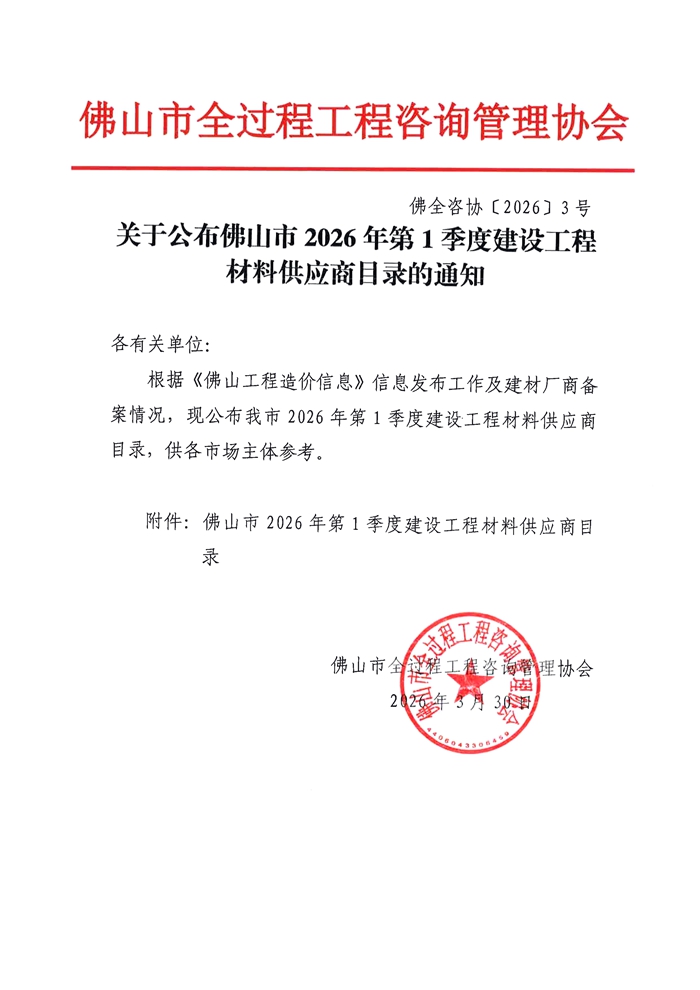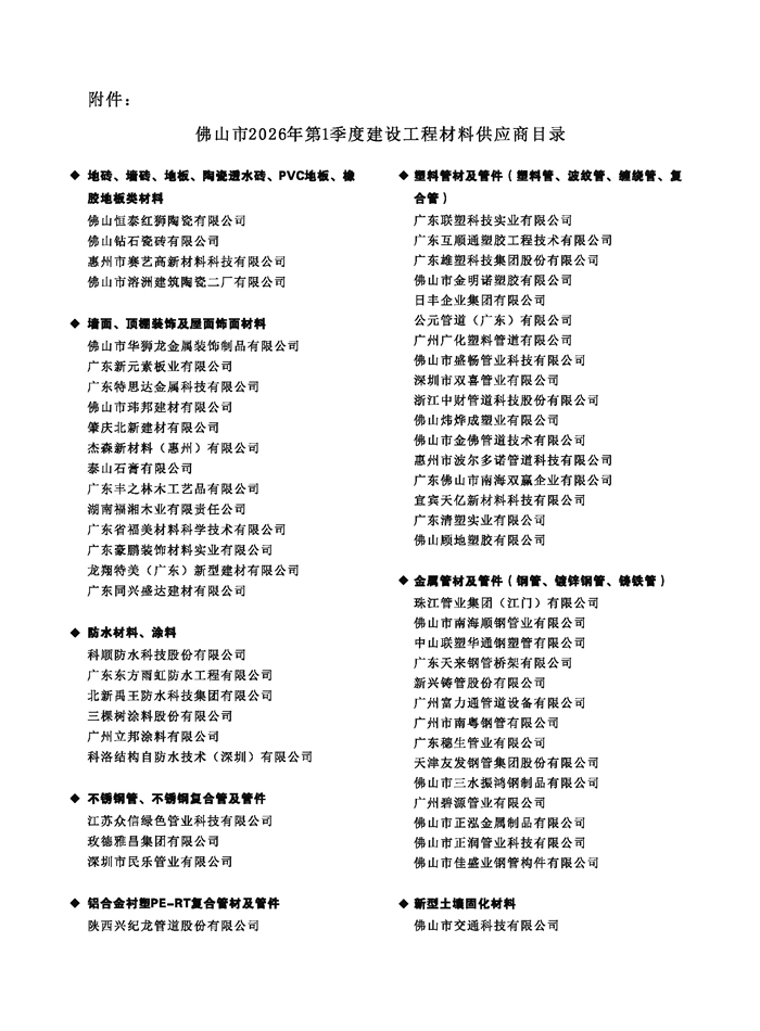 關于公布佛山市2026年第1季度建設工程材料供應商目錄的通知