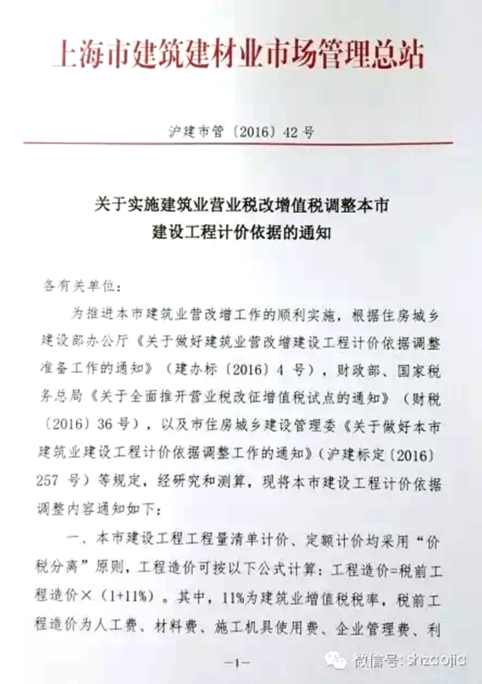 上海市建筑建材業市場管理總站關于實施建筑業營業稅改增值稅調整本市建設工程計價依據的通知
