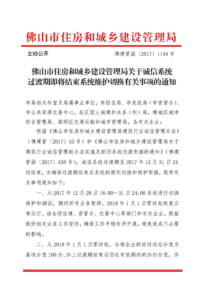 佛山市住房和城鄉建設管理局關于誠信系統過渡期即將結束系統維護切換有關事項的通知