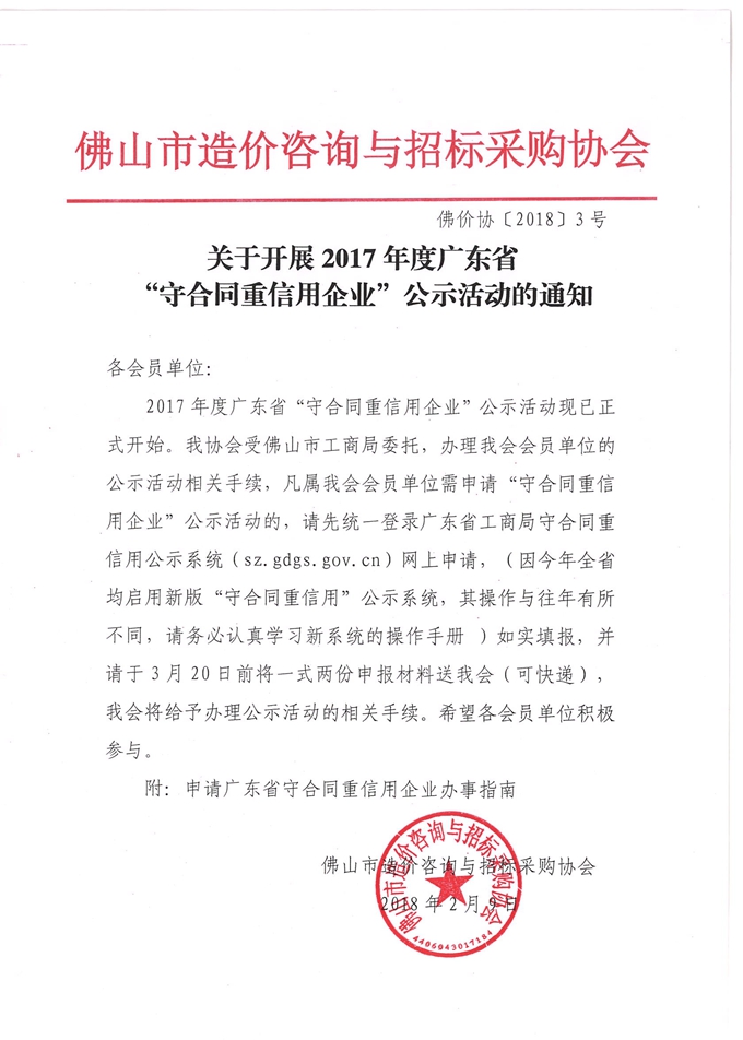 關于開展2017年度廣東省“守合同重信用企業”公示活動的通知