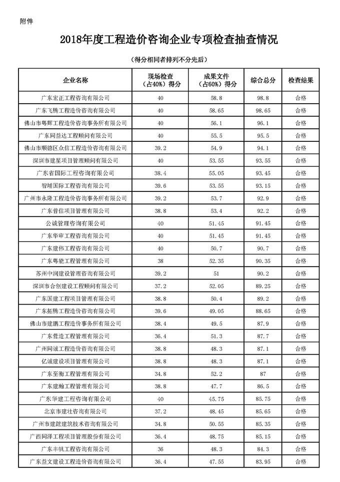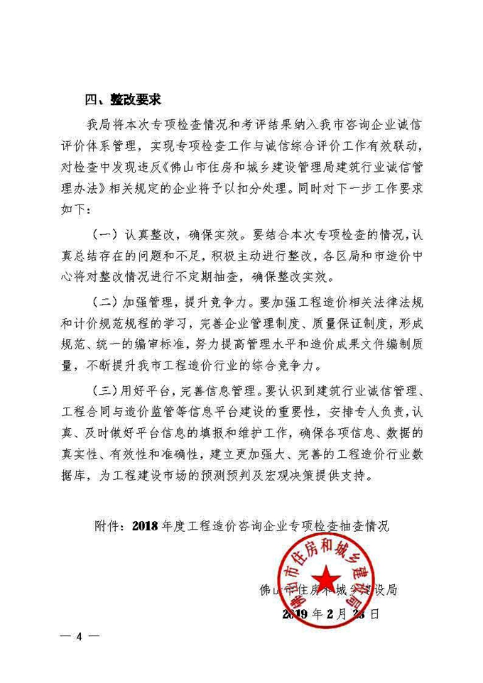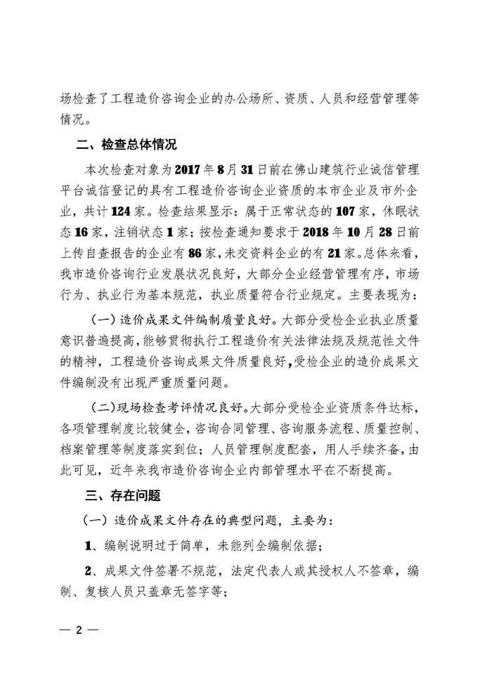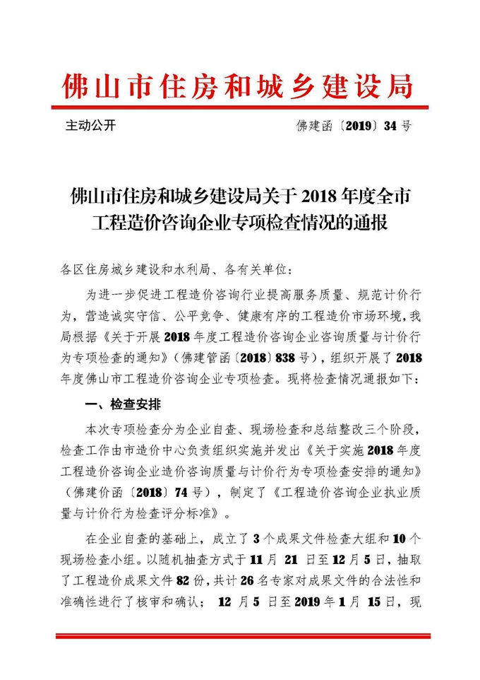 佛山市住房和城鄉(xiāng)建設局關于2018年度全市工程造價咨詢企業(yè)專項檢查情況的通報