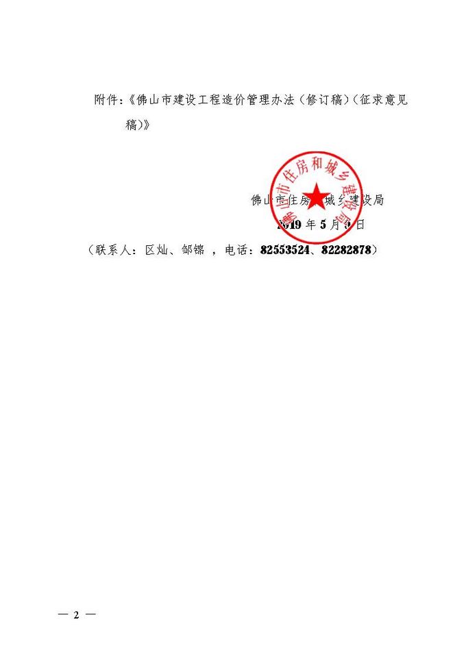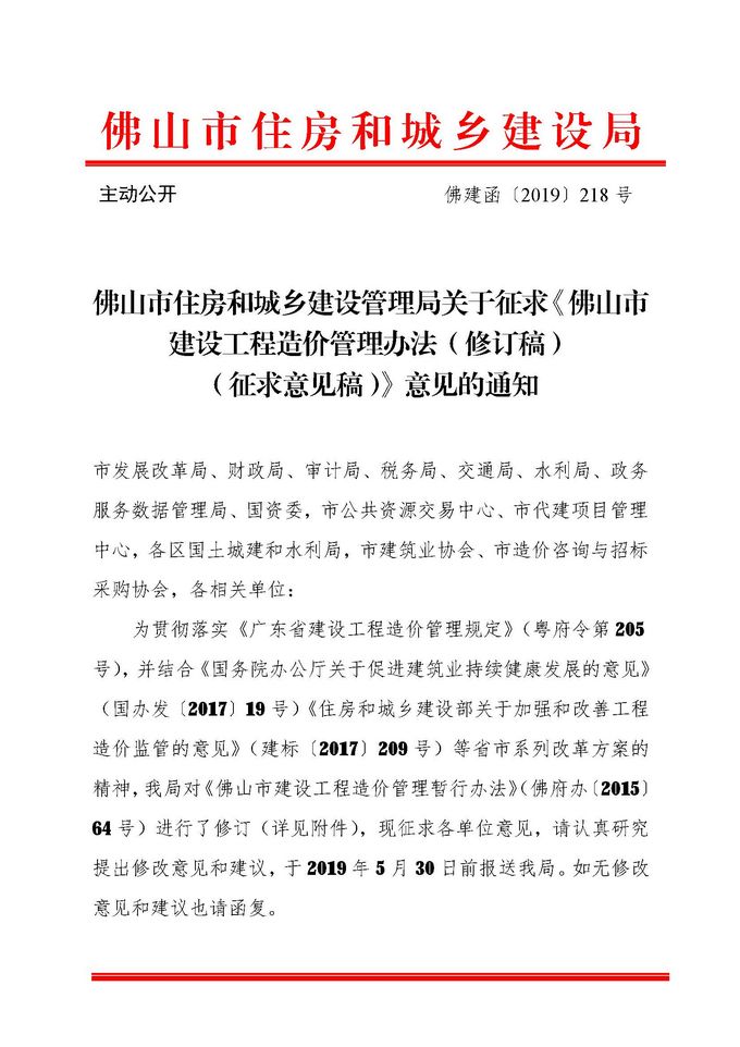 佛山市住房和城鄉建設管理局關于征求《佛山市建設工程造價管理辦法(修訂稿)(征求意見稿)》意見的通知
