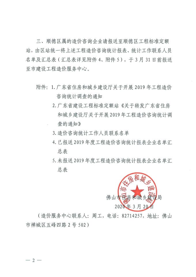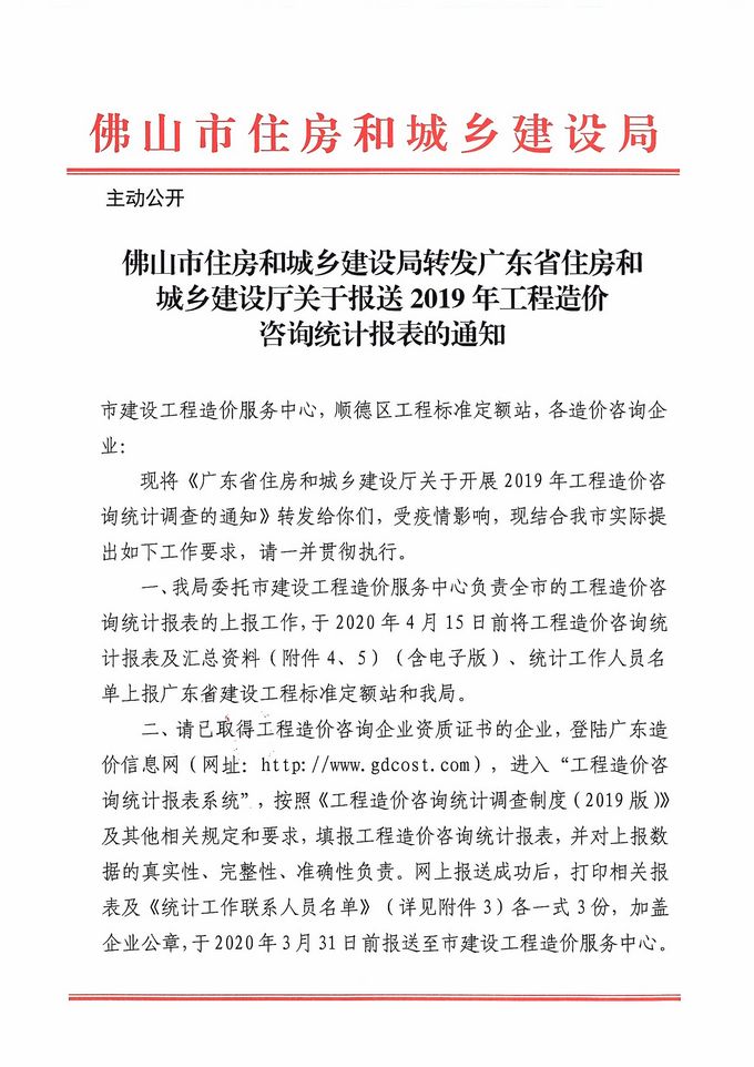 佛山市住房和城鄉(xiāng)建設局轉發(fā)廣東省住房和城鄉(xiāng)建設廳關于報送2019年工程造價咨詢統(tǒng)計報表的通知