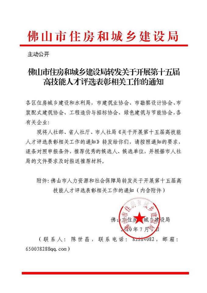 佛山市住房和城鄉建設局轉發關于開展第十五屆高技能人才評選表彰相關工作的通知