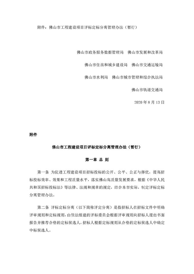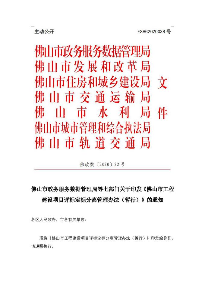 佛山市政務服務數據管理局等七部門關于印發《佛山市工程建設項目評標定標分離管理辦法(暫行)》的通知
