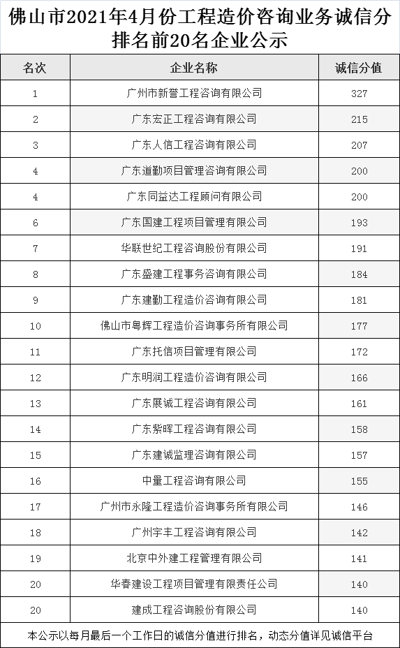 佛山市2021年4月份工程造價咨詢業(yè)務誠信分排名前20名企業(yè)公示