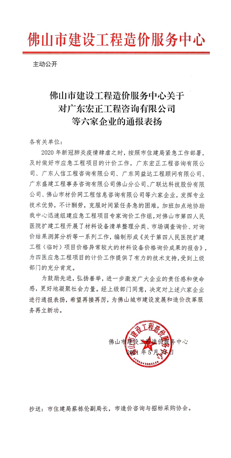佛山市建設工程造價服務中心關于對廣東宏正工程咨詢有限公司等六家企業(yè)的通報表揚