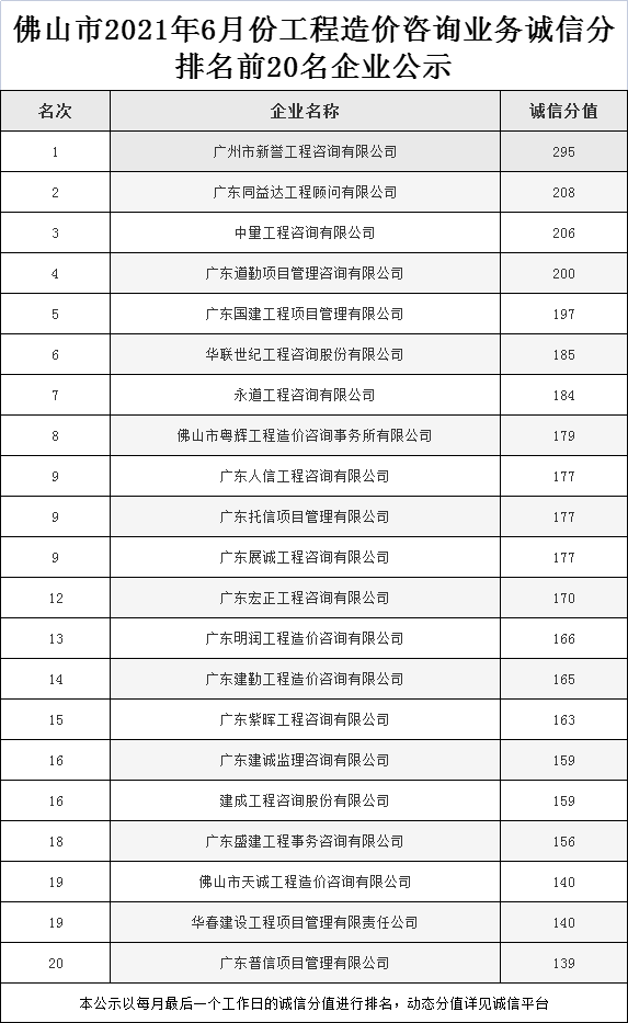 佛山市2021年6月份工程造價咨詢業務誠信分排名前20名企業公示