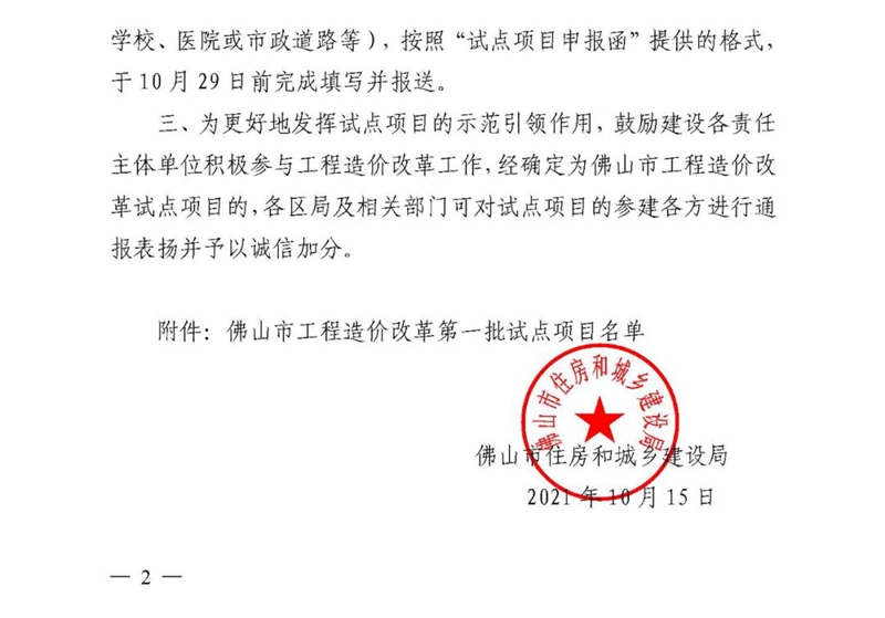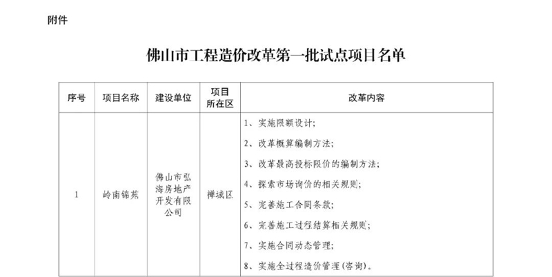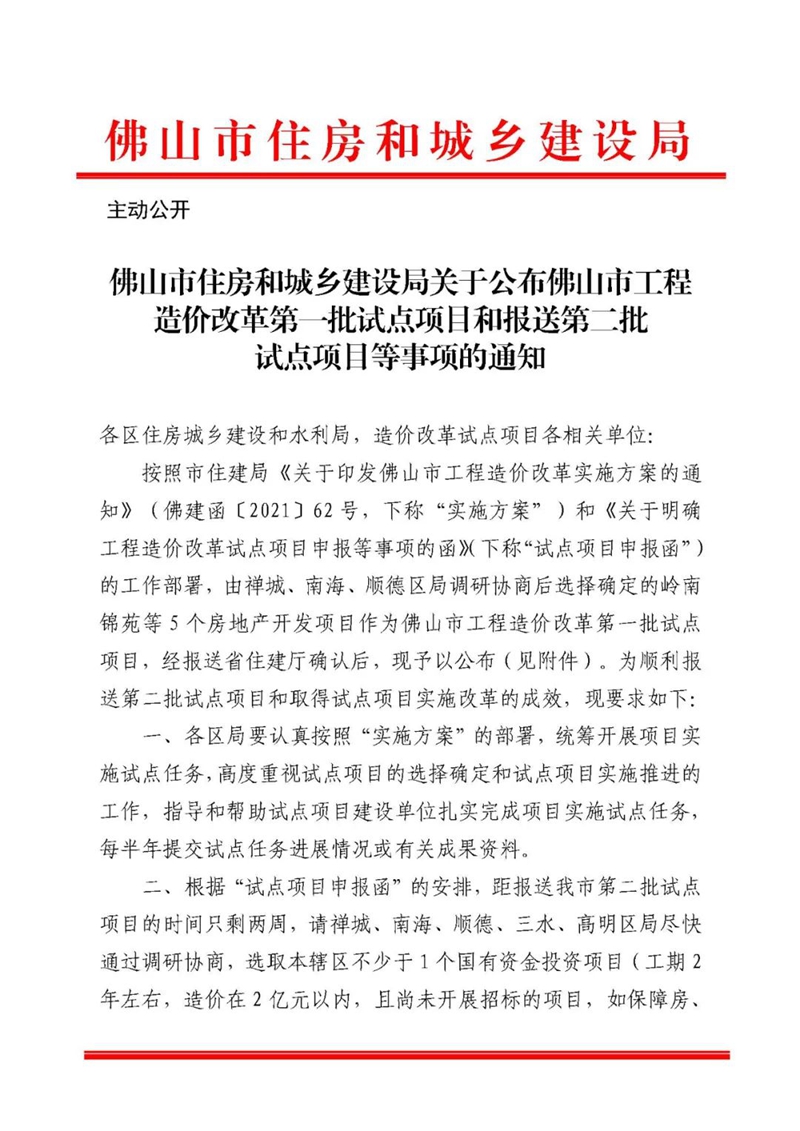 轉發| 佛山市住房和城鄉建設局關于公布佛山市工程造價改革第一批試點項目和報送第二批試點項目等事項的通知