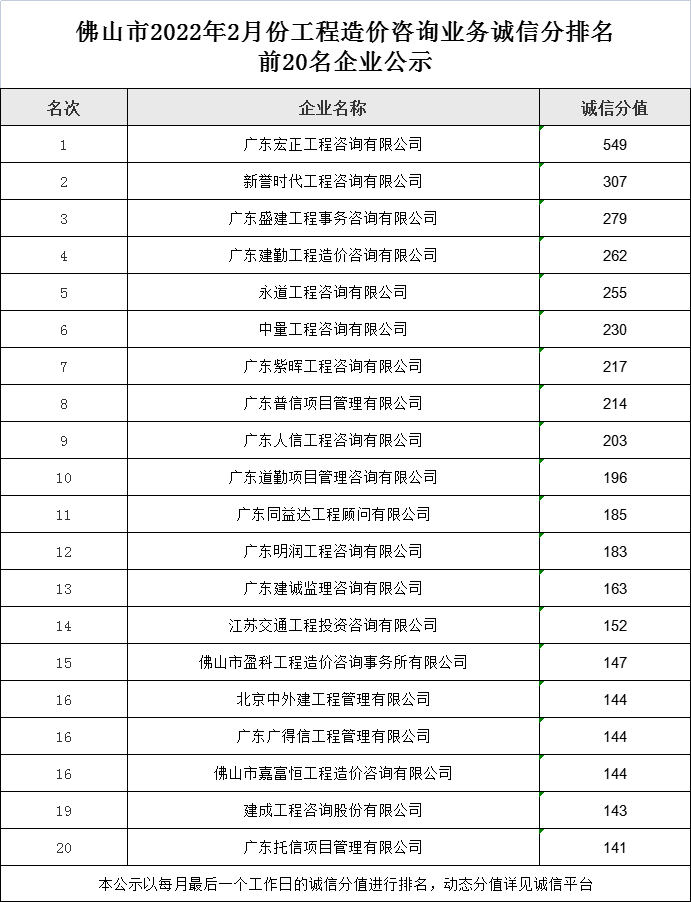 佛山市2022年2月份工程造價咨詢業務誠信分排名前20名企業公示