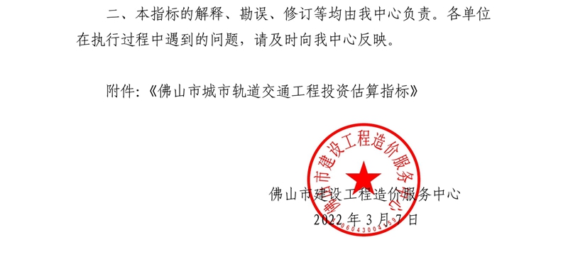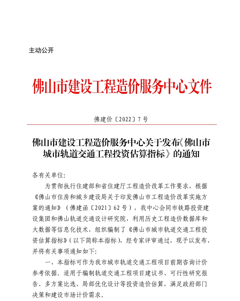 佛山市建設(shè)工程造價(jià)服務(wù)中心關(guān)于發(fā)布《佛山市城市軌道交通工程投資估算指標(biāo)》的通知