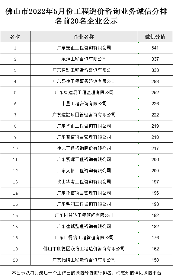 佛山市2022年5月份工程造價咨詢業務誠信分排名前20名企業公示