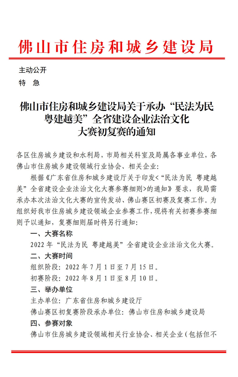 轉發 | 佛山市住房和城鄉建設局關于承辦“民法為民 粵建越美”全省建設企業法治文化大賽初復賽的通知