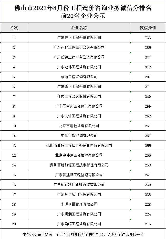 佛山市2022年8月份工程造價(jià)咨詢業(yè)務(wù)誠信分排名前20名企業(yè)公示
