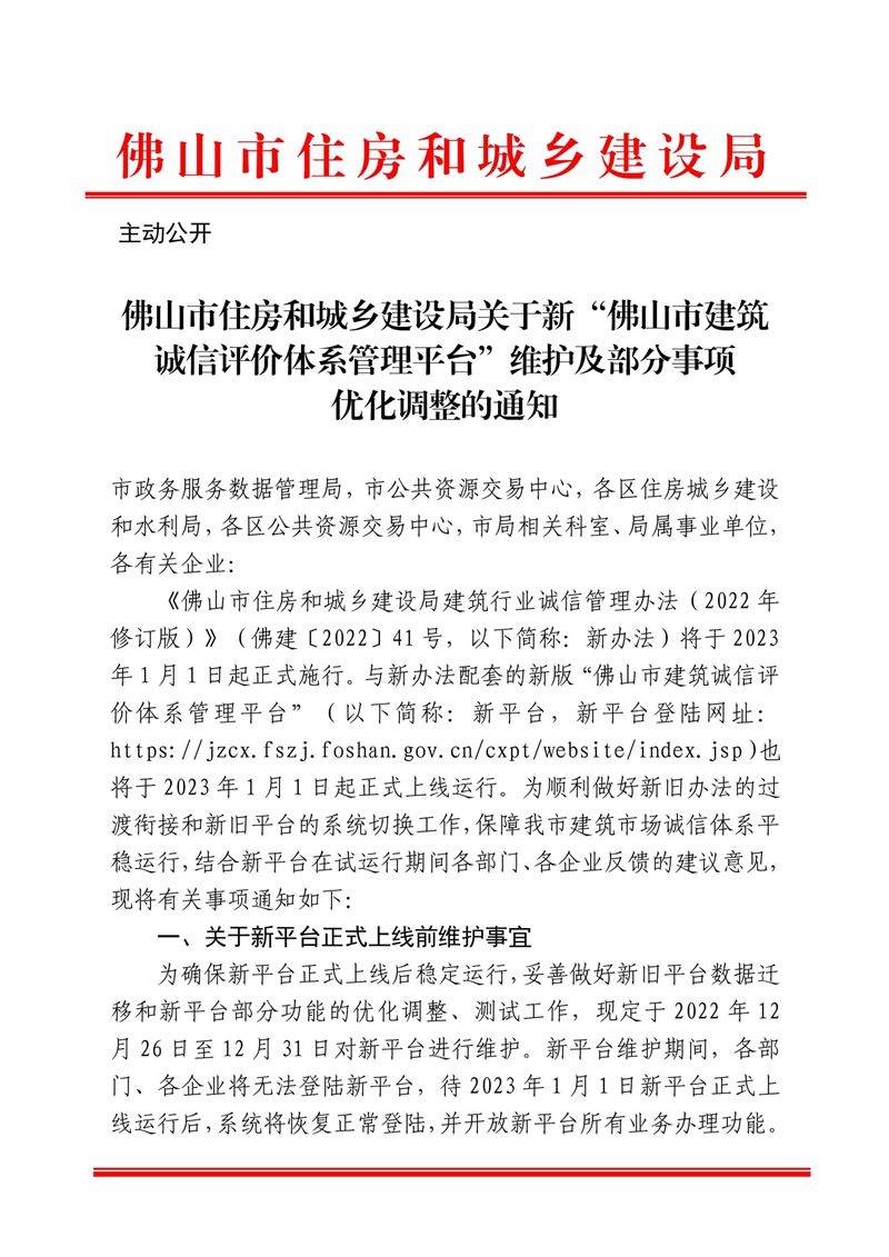 佛山市住房和城鄉(xiāng)建設(shè)局關(guān)于新“佛山市建筑誠信評價體系管理平臺”維護(hù)及部分事項優(yōu)化調(diào)整的通知