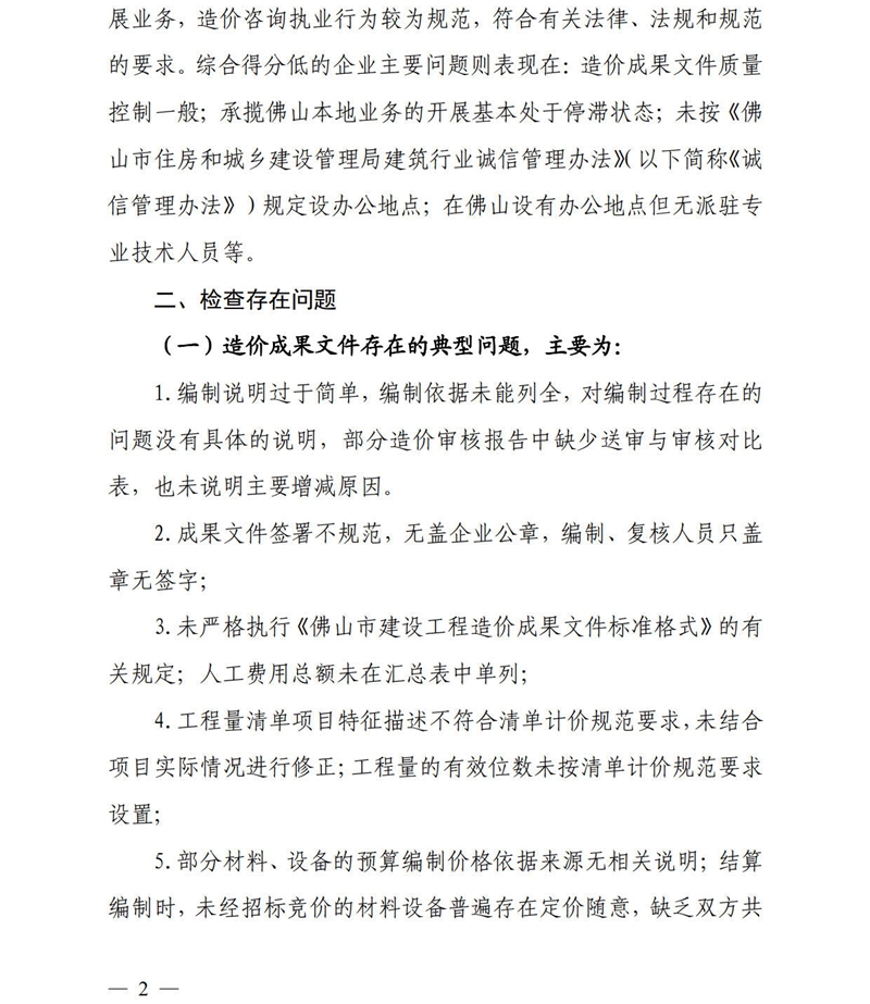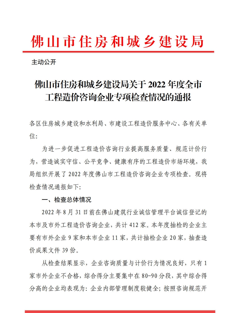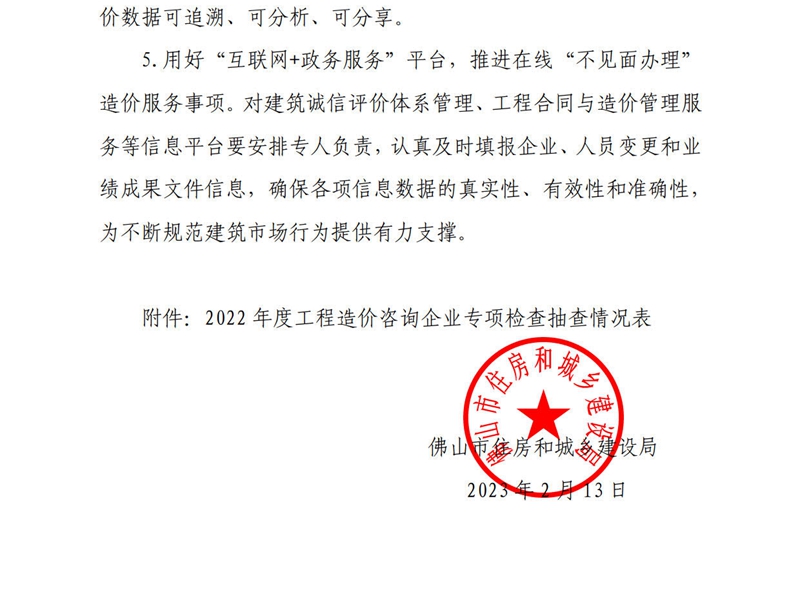 轉發 | 佛山市住房和城鄉建設局關于2022年度全市工程造價咨詢企業專項檢查情況的通報