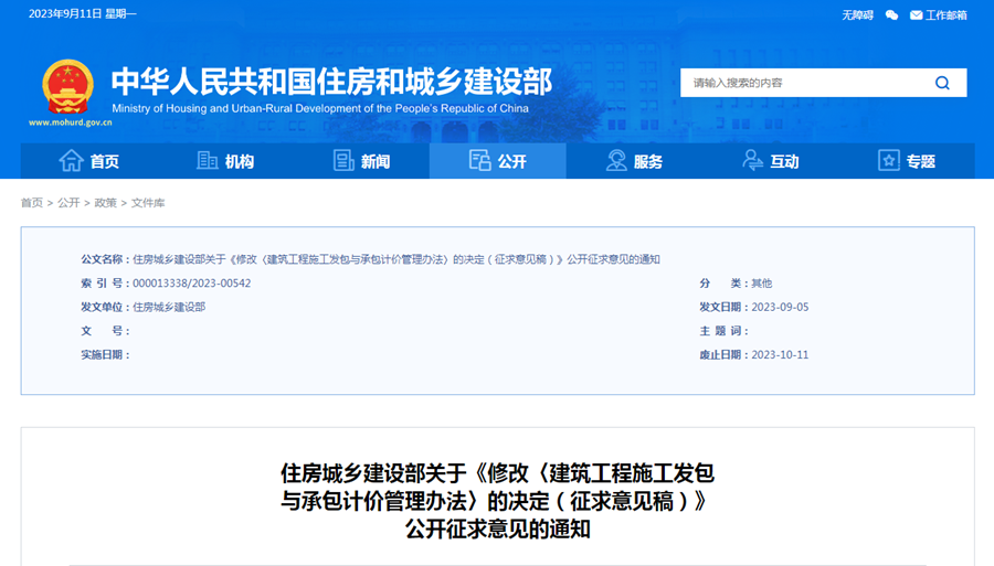 轉發 | 住房城鄉建設部關于《修改〈建筑工程施工發包與承包計價管理辦法〉的決定(征求意見稿)》公開征求意見的通知