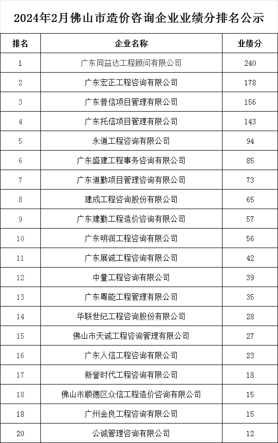 轉(zhuǎn)發(fā) | 2024年2月佛山市造價咨詢企業(yè)業(yè)績分排名公示
