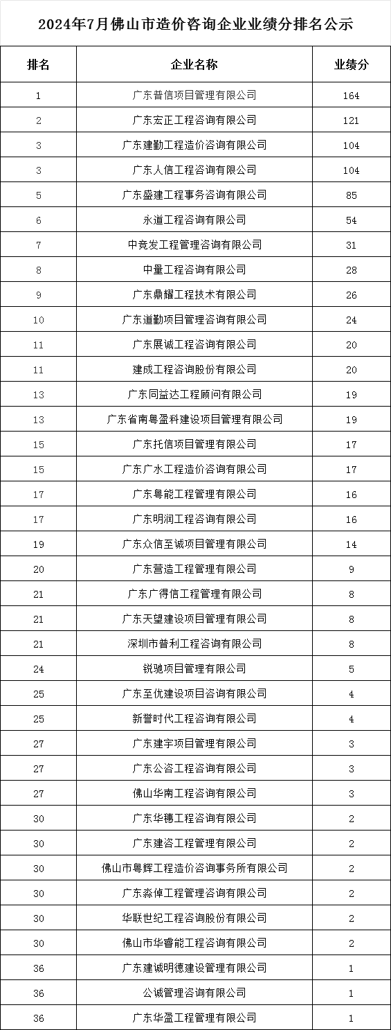 轉(zhuǎn)發(fā) | 2024年7月佛山市造價(jià)咨詢企業(yè)業(yè)績分排名公示