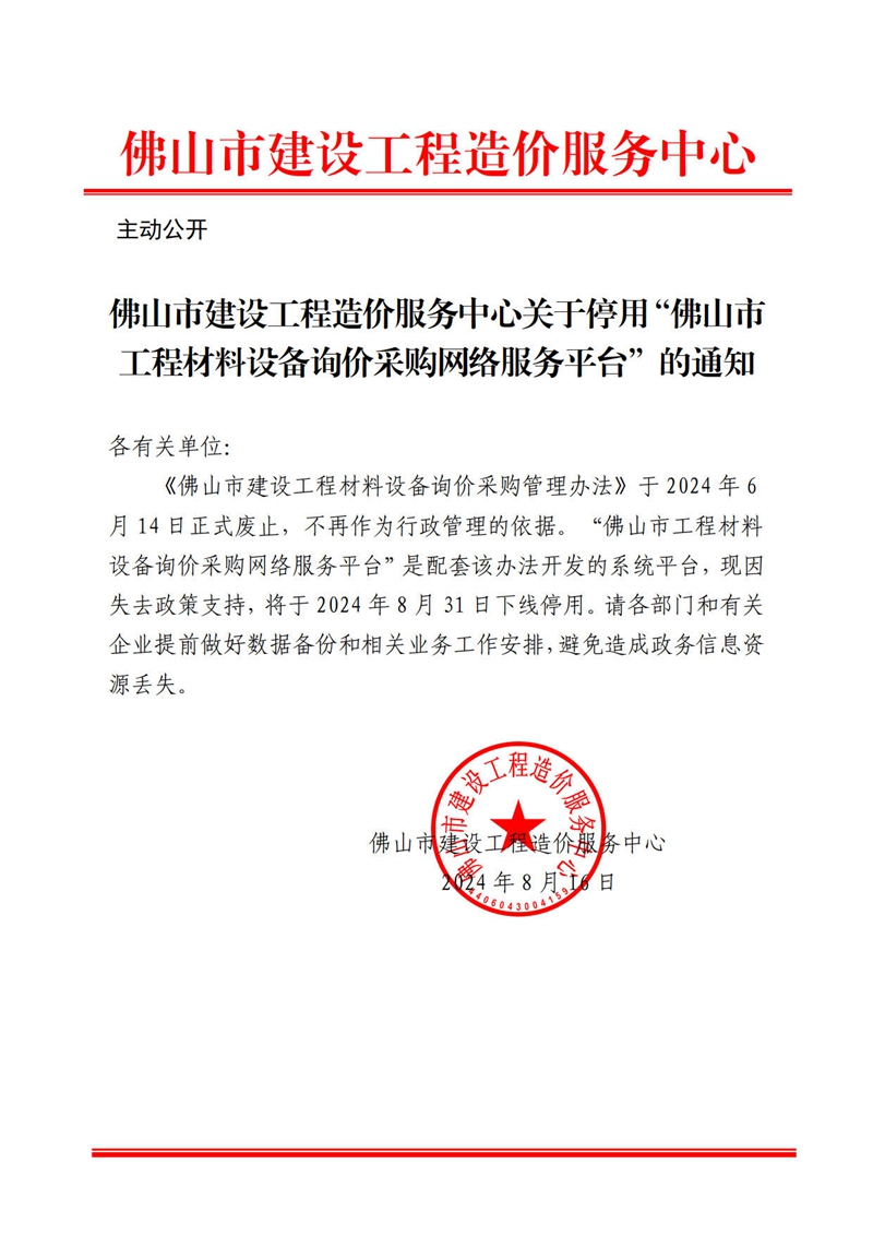 轉發 | 佛山市建設工程造價服務中心關于停用“佛山市工程材料設備詢價采購網絡服務平臺”的通知