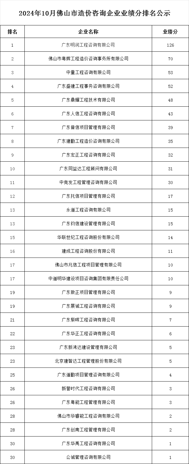 轉(zhuǎn)發(fā) | 2024年10月佛山市造價(jià)咨詢企業(yè)業(yè)績(jī)分排名公示