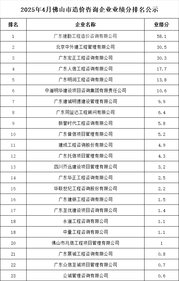 轉發 | 2025年4月佛山市造價咨詢企業業績分排名公示