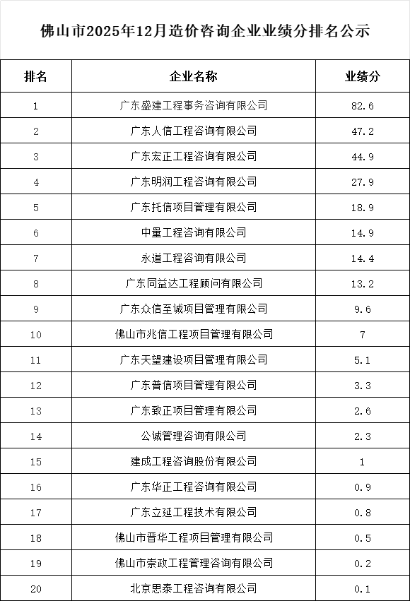 轉發 | 佛山市2025年12月造價咨詢企業業績分排名公示