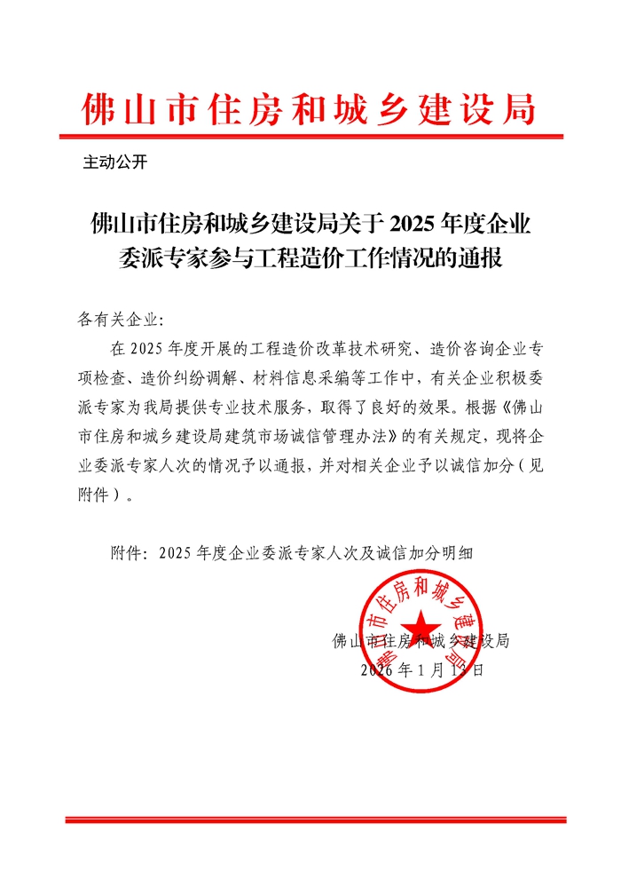 轉發 | 佛山市住房和城鄉建設局關于2025年度企業委派專家參與工程造價工作情況的通報