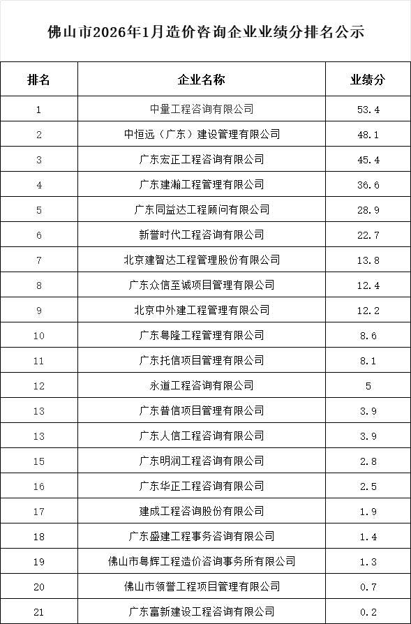 轉(zhuǎn)發(fā) | 佛山市2026年1月造價(jià)咨詢企業(yè)業(yè)績(jī)分排名公示