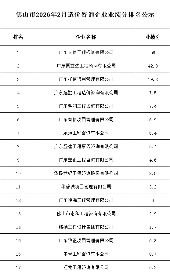 轉發 | 佛山市2026年2月造價咨詢企業業績分排名公示