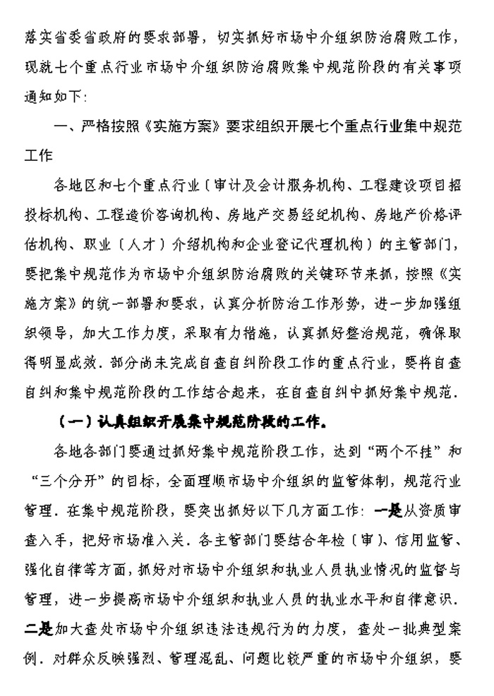 關(guān)于認(rèn)真抓好重點行業(yè)的集中規(guī)范切實抓好市場中介組織防治腐敗工作的通知