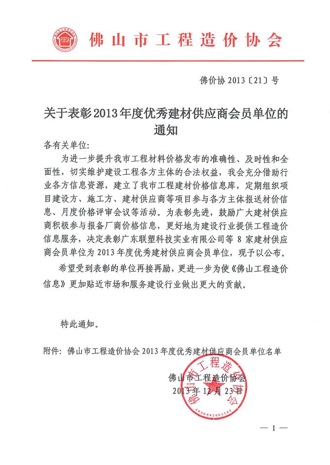 關(guān)于表彰2013年度優(yōu)秀建材供應(yīng)商會員單位的通知