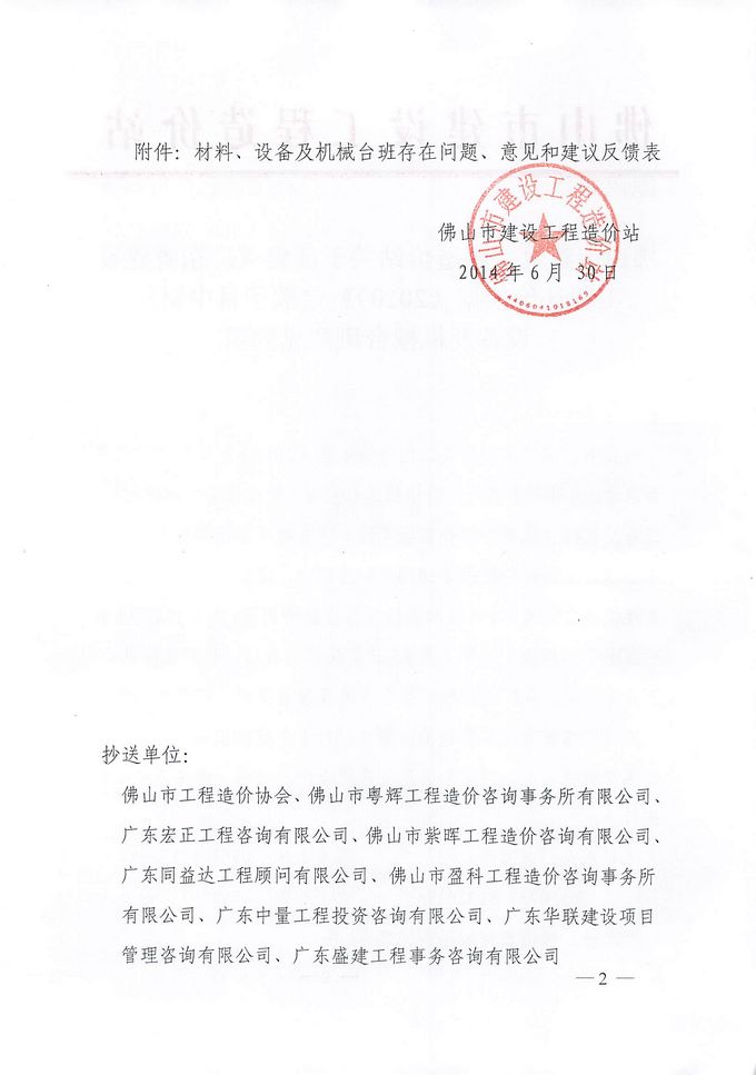 佛山市建設(shè)工程造價(jià)站關(guān)于征集《廣東省建設(shè)工程計(jì)價(jià)依據(jù)(2010)》定額子目中材料設(shè)備及機(jī)械臺(tái)班意見的函