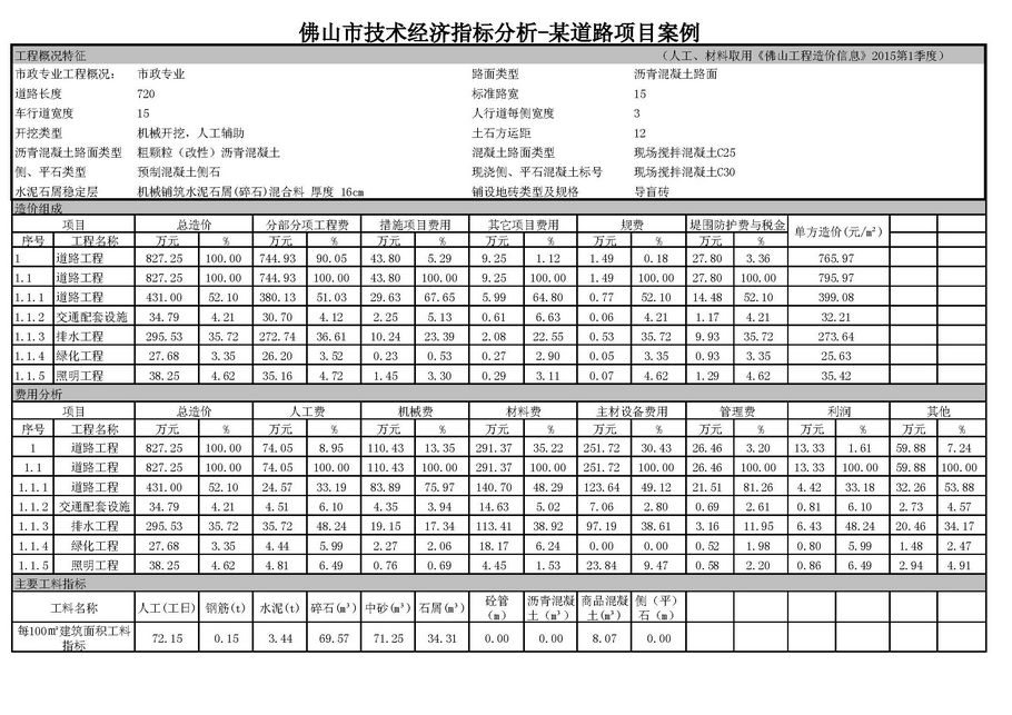 佛山市2015年第2季度技術經濟指標分析—某道路項目案例