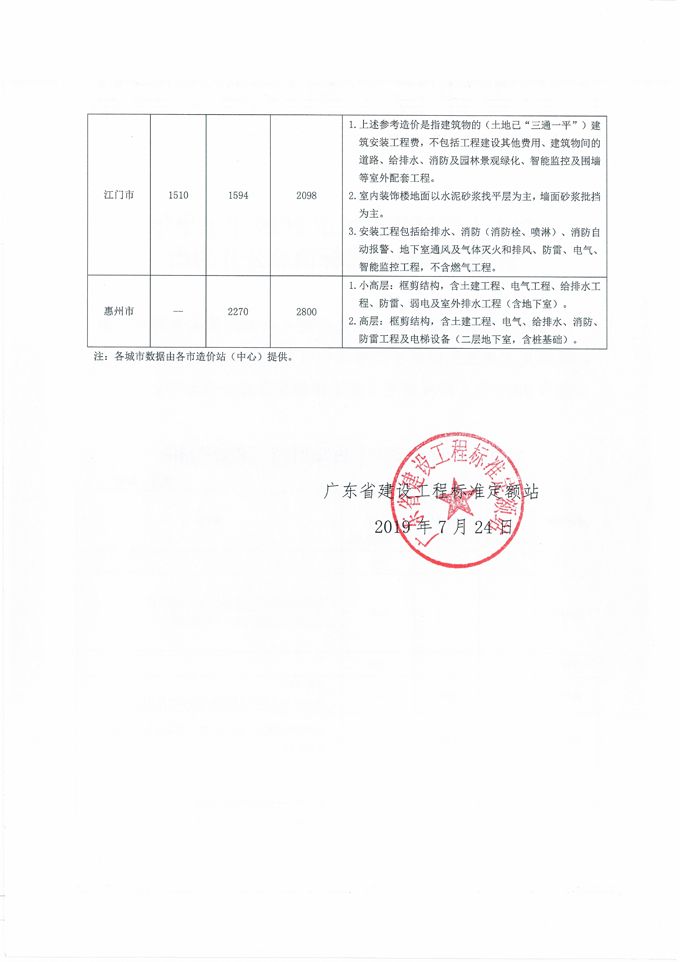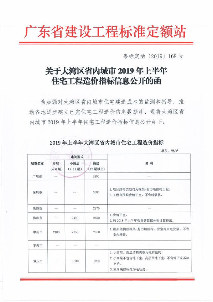 關于大灣區省內城市2019年上半年住宅工程造價指 標信息公開的函