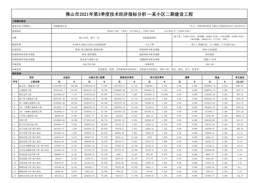 佛山市2021年第3季度技術經濟指標分析—某小區二期建設工程