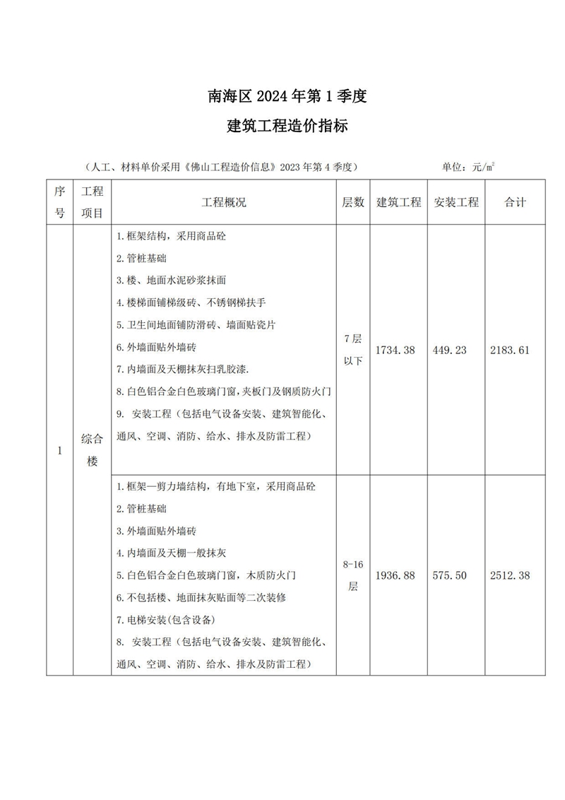 南海區(qū)2024年第1季度建筑工程造價指標(biāo)