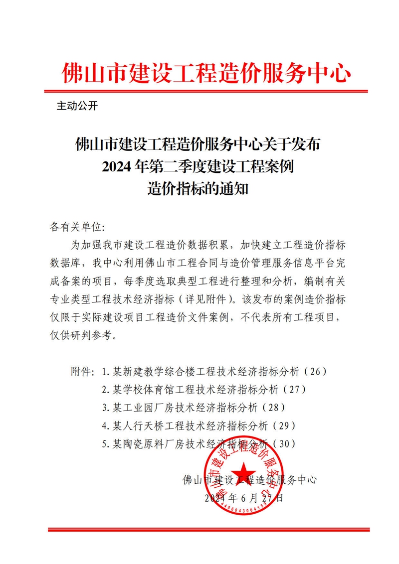 轉發 | 佛山市建設工程造價服務中心關于發布2024年第二季度建設工程案例造價指標的通知