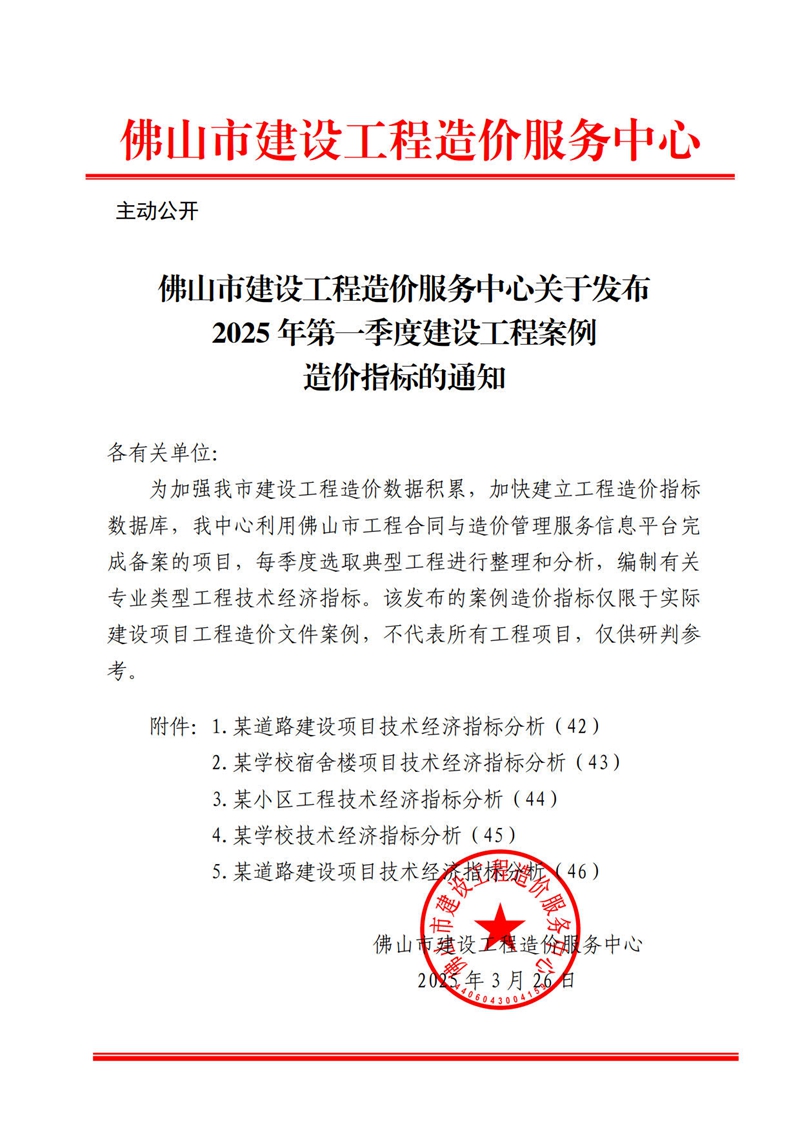 轉發 | 佛山市建設工程造價服務中心關于發布2025年第一季度建設工程案例造價指標的通知