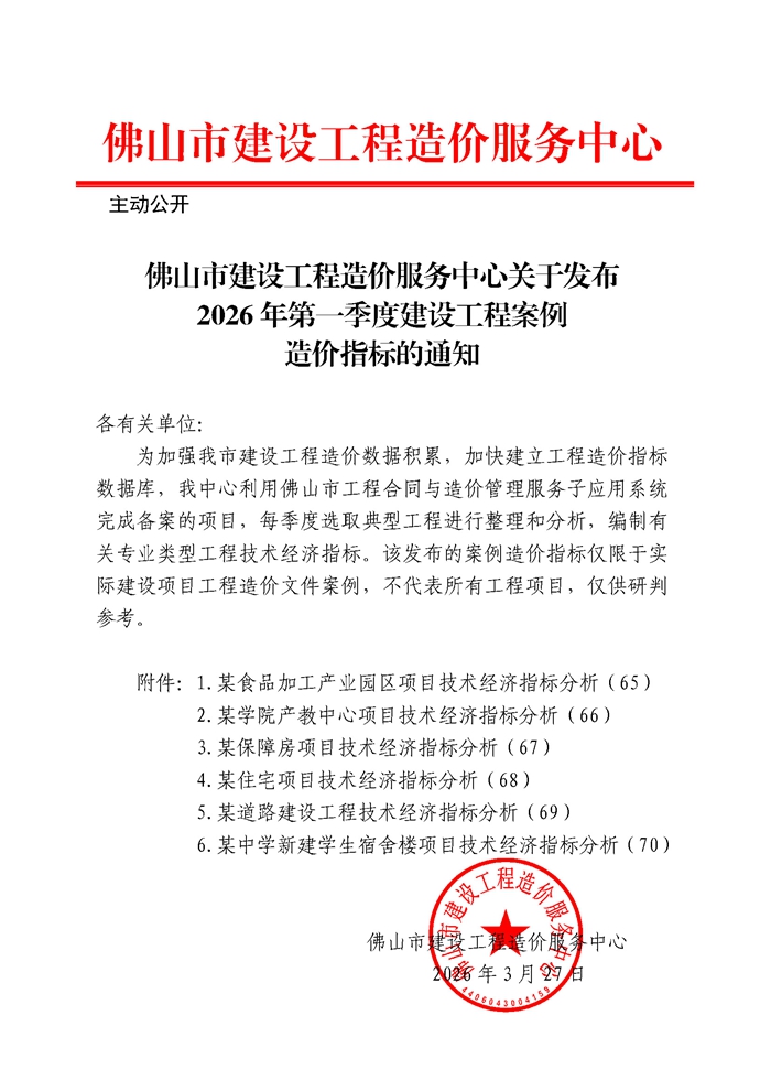 轉發 | 佛山市建設工程造價服務中心關于發布2026年第一季度建設工程案例造價指標的通知