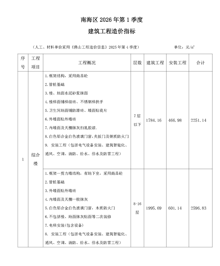 南海區(qū)2026年第1季度建筑工程造價指標(biāo)