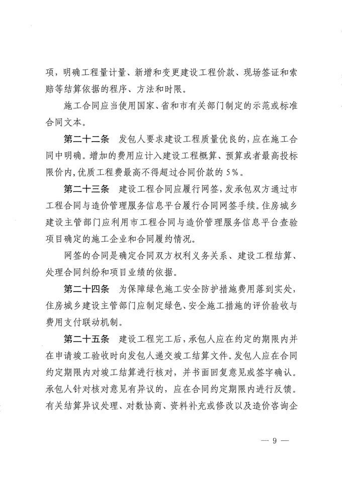明確工程計價活動應符合國家、省和市現行計價標準規定和辦法,其次造價控制及管理應貫穿所有基建程序,各階段造價文件包括投資估算、概算、預算、招標工程量清單、最高投標限價或招標標底、投標報價、合同價、合同價款調整和竣工結算等均應按有關相應標準規定和合同約定進行編制。明確實施全過程造價咨詢控制和施工過程結算,實施人工費用和工程款分賬管理,督導施工工期合理確定,明確了概算價、最高投標限價、結算文件備案和施工合同網簽的要求。重點對工程定價幾個重要環節如招投標交易、合同價訂立、工程價款調整、過程結算以及竣工結算等,規范并明確了具體程序和方法。